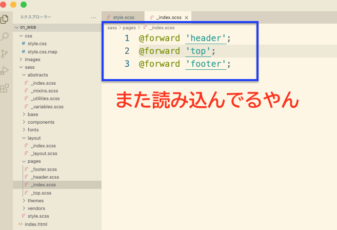 さらに、「フォルダを読み込んで」と設定した場合は自動的に_index.scssを読み込む仕組みになっています。ほな、pagesフォルダの_index.scssを見てみましょ。